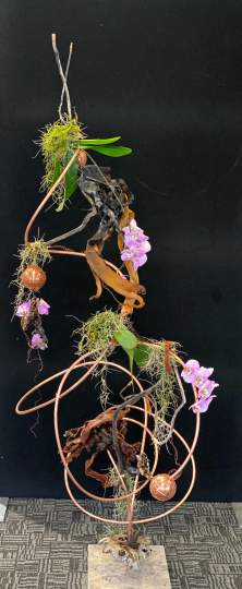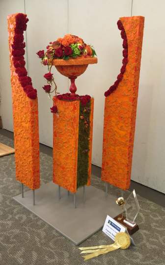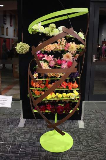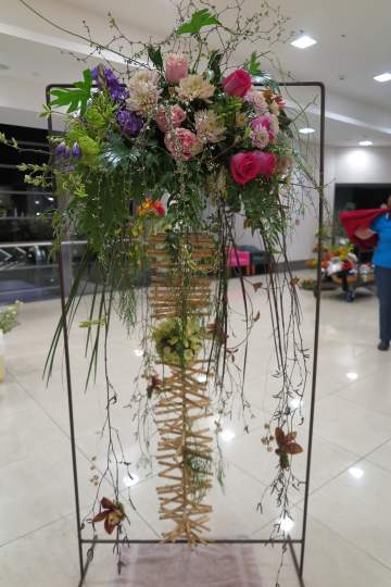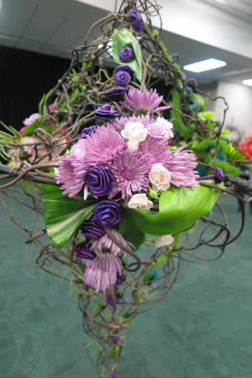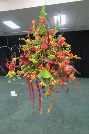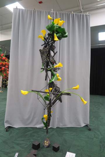 Barb’s design was a masterful example of clever construction and well-chosen plant material. The effect was a light and airy creation – almost ethereal – and full of interesting components and complementary colours. The techniques used ensured everything stayed fresh throughout the days of the exhibition without further attention.