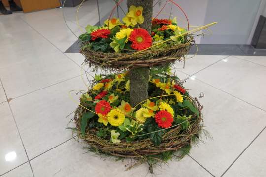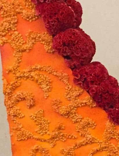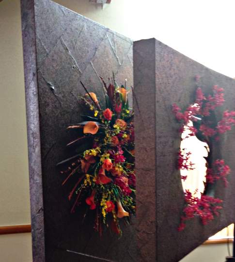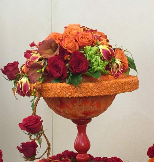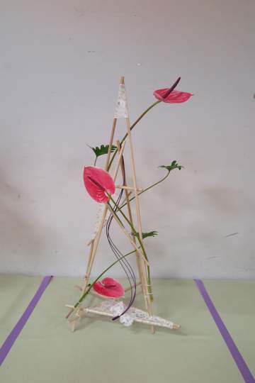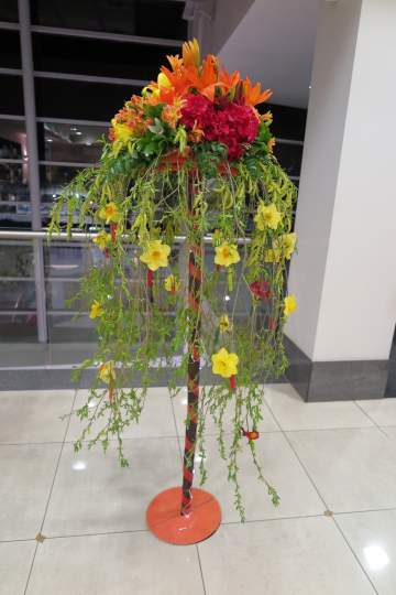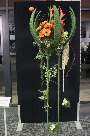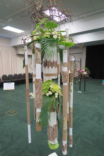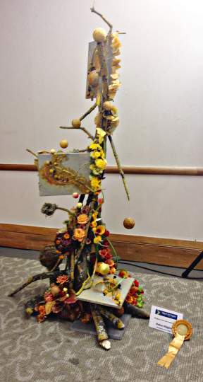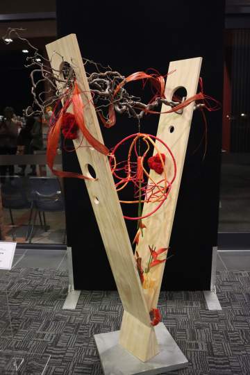 Mitred claddies (Phormium flower stalks) all connect together forming interesting components. The orange tissue paper and cane forms, which echo the triangular shapes in the mitred claddies, connect the components, and the orange wool inserted into the grooves in the palm spathes connect the spathes to the other components. Orange Heliconia complete the design and the colour orange suggests energy which all comes together as ‘Connected Energy’.