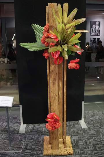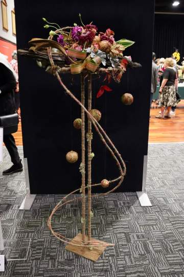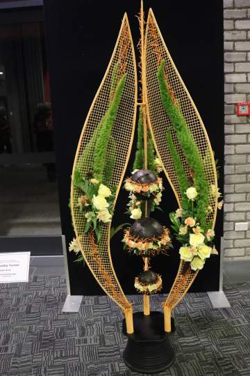 I started making mitres using Phormium after a wonderful workshop the Geraldine Floral Art Group had held in November 2021, so when the title for the DOY came out in January 2023 I had a collection of various sizes to choose from. The palm spathes had been collected during trips to the North Island over a number of years and brought back to the south on the plane. These were my inspiration once the title was out and playtime in the garage began in earnest during February this year.
