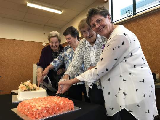 Tables adorned with golden topiaries on black cloths set the stage the next day for the 50th Anniversary celebrations. A beautiful cake had been made and iced by Allison Ingram and a delicious luncheon prepared by Sue Noble and her team at Takapuna Floral Art Club. The day was made even more special with the announcement of our three new Life Members, Elizabeth Konig, Jan Goode and Jackie Milina.