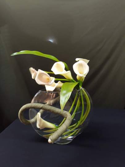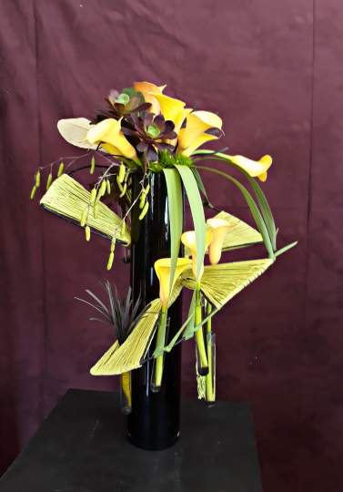 1st - Ruth Orange. A design incorporating fibre and yellow callas in a dazzling pristine design. Ruth was also the recipient of the Colour Award.