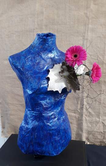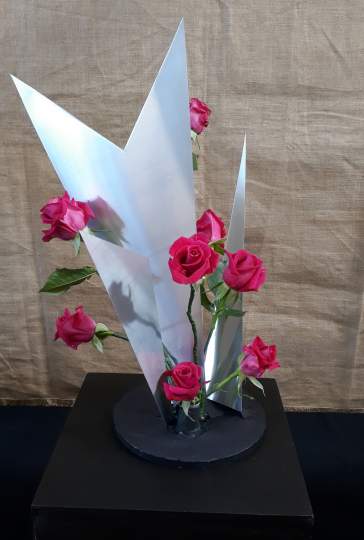 HC equal novice section- Janet Kingsbury. Chards of stainless steel and bright pink roses