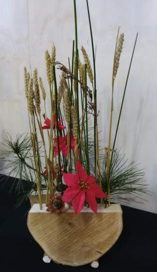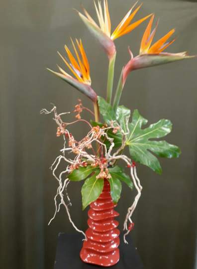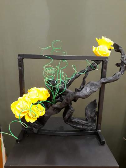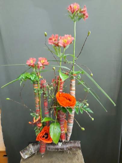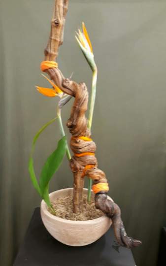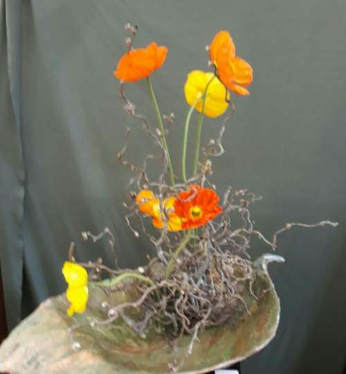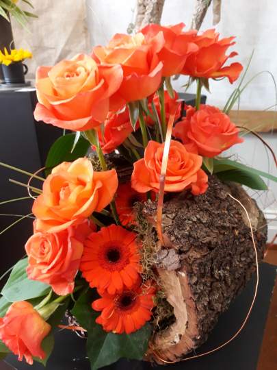 HC equal novice section- Lois Fraser. Orange flowers designed in a textured piece of wood attracted much attention