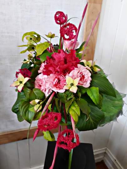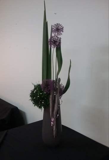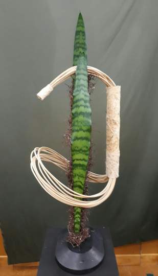 2nd - Liz Chapman. The placement of the plant material, Restio reeds also known as Oi Oi and Podophyllium foliage created the WOW in this design. The wire and wall flowers provided the Accent.
