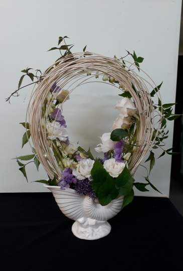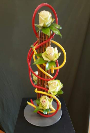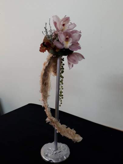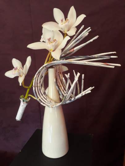 3rd – Jenny Buchannan. Jenny’s design using wire bound with newspaper and one stem of orchid had the WOW factor created by restrained use of plant material and components. Jenny was the recipient on the Innovative Award.