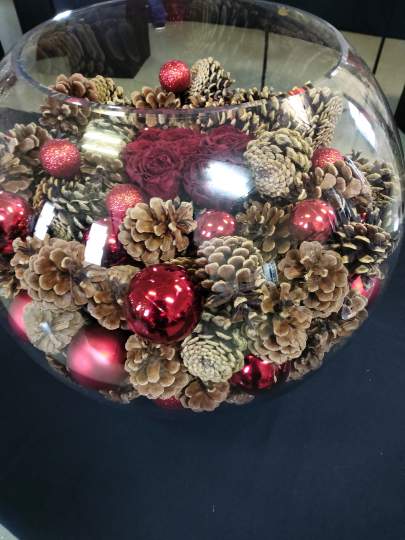 A centre table of glass, cones, baubles and cornus branches three metres tall, set the scene to create a stunning yuletide atmosphere. In addition, four members did ‘how to do’ demonstrations hourly, which showed viewers easy-to-achieve and sustainable festive ideas. These were well received, with the public waiting on the hour.