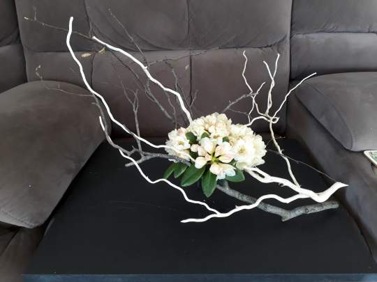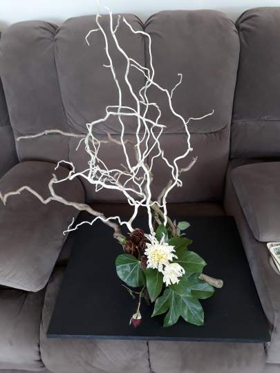 In the evening we completed our second design. We all had the same staging and type of plant material: two branches different in texture, colour and shape, and minimal foliage and flowers.