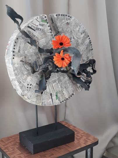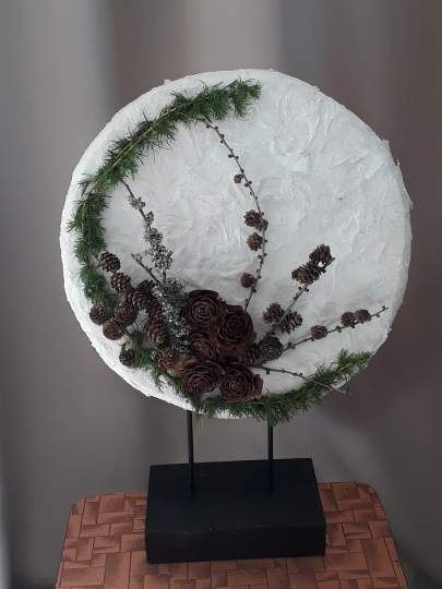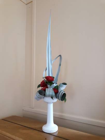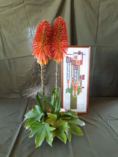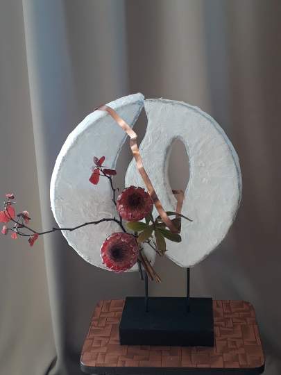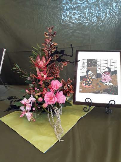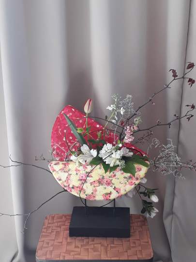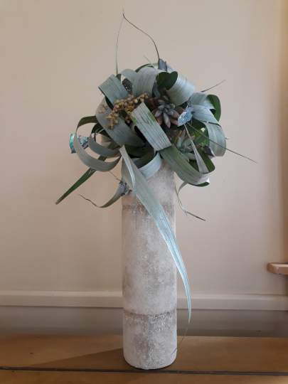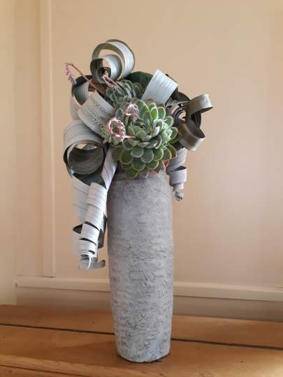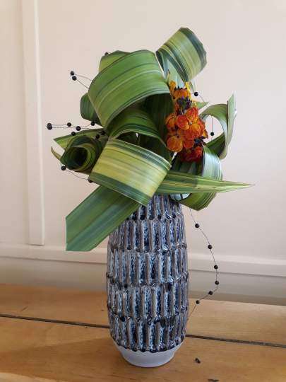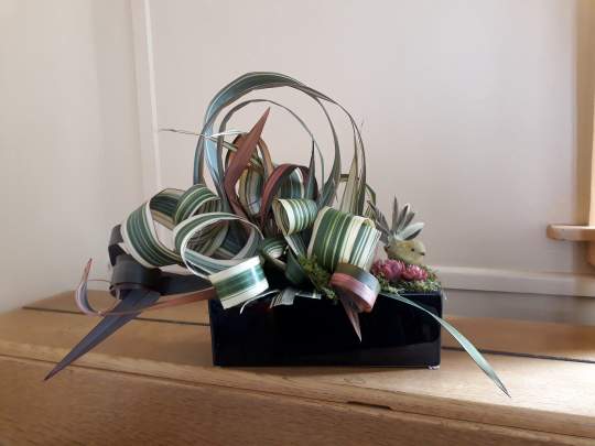 In September Jan Chambers showed members how to create a design using rolled flax or astellia leaves, and with minimal use of flowers or other plant material. Jan explained the mechanics for rolling the leaves to make them look impressive and the design interesting. Some members added succulents, camellias or other flowers from their garden.