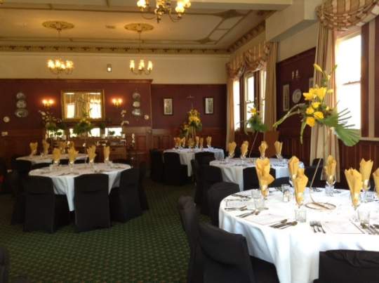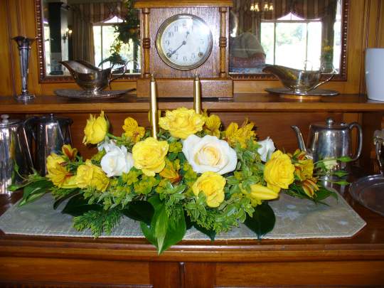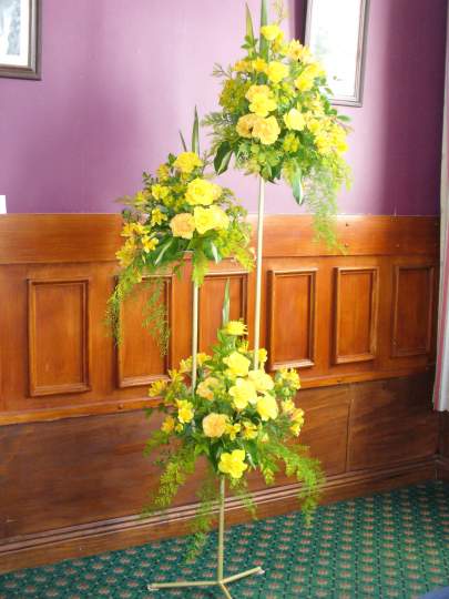 A welcome ‘50’ wall hanging created with succulents by Anne Flutey greeted all at the entrance. This was accompanied by a massed design inspired by Julia Clements. A triple U stand of old became a golden masterpiece created by Jenny Thomson, while S shaped stands decorated each table giving an overall golden display and setting the atmosphere. The table designs were created by Lynne Gray and Shirley Hastings.