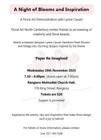 Floral Art North Canterbury welcomesyou to 'Paper Re-Imagined' a demonstration by Lynne CauserWednesday 26th November 2025